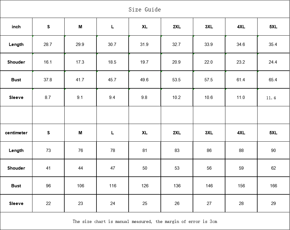 inch S M L XL 2XL 3XL 4XL 5XL
